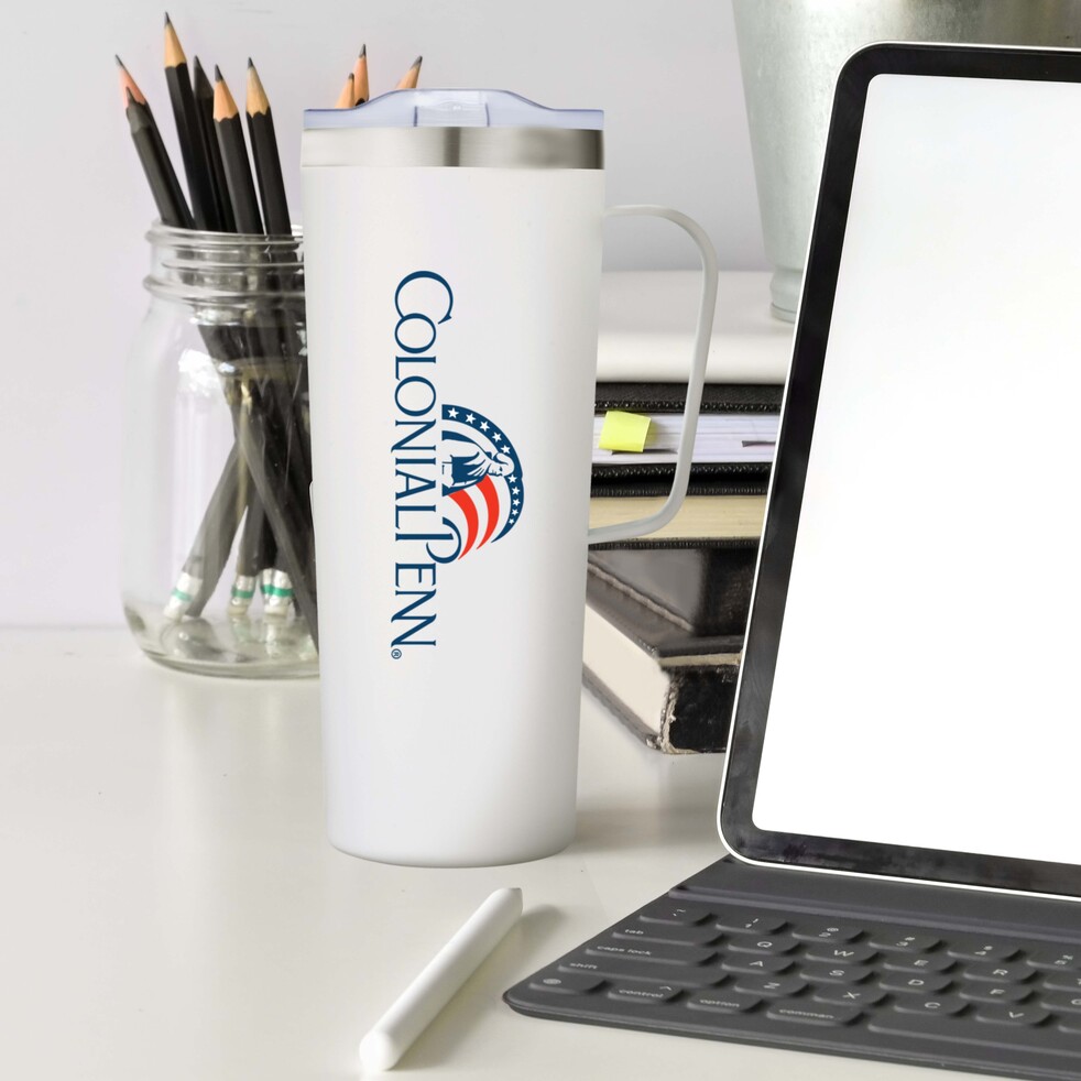 The ultimate in drinkware with a robust 28 oz capacity, a comfortable handle and a narrow design to fit in cup holders. Double-wall vacuum insulating technology to keep beverages at the temperature you want. Choose from 4 proven, traditional colors. Push-In Lid with Slider, Fits Most Car Cup Holders, Keeps Drinks Hot for 12 Hours Cold for 24 Hours, Powder-Coated Finish, FDA Compliant BPA Free. Hand Wash Recommended.