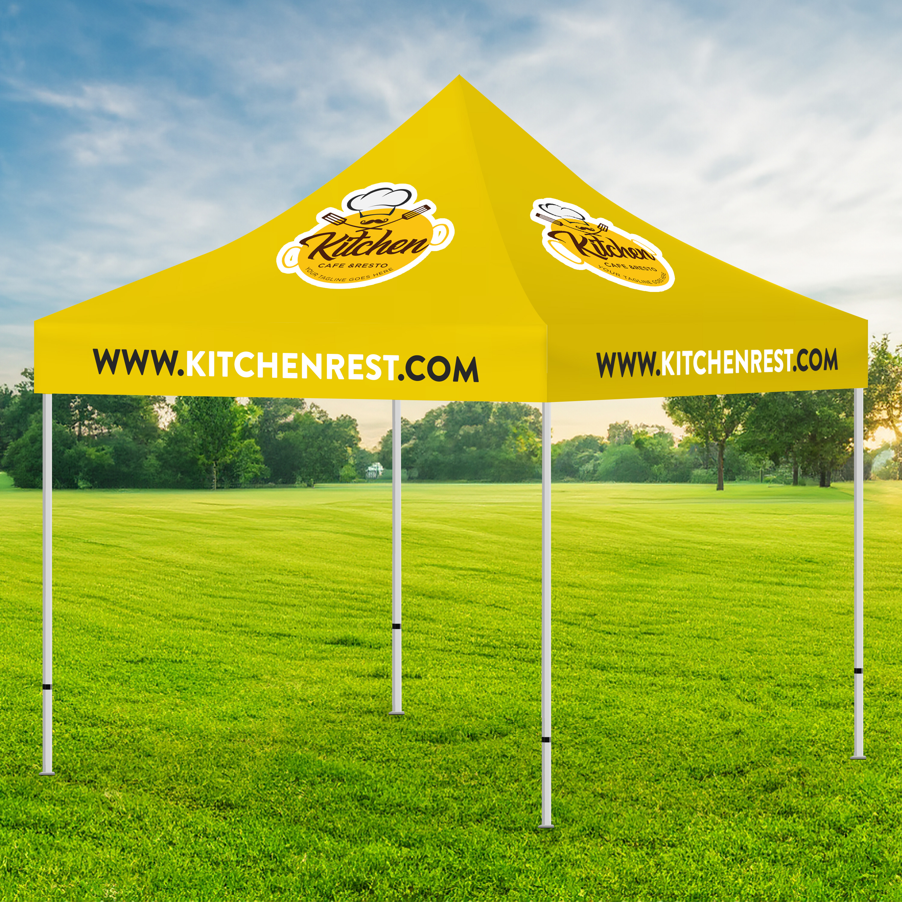 Providing maximum visibility and shelter with budget-friendly pricing, this full color, durable event tent has you covered. Constructed with high quality, water and fire-resistant, UV-protected 600 denier polyester fabric and 30mm steel. Includes tent frame, polyester canopy, 4 metal ground stakes, four small canvas drawstring sand weight bags, and storage bag. Complies with Prop 65. Measures 10' W x 10' H. Easy to assemble.