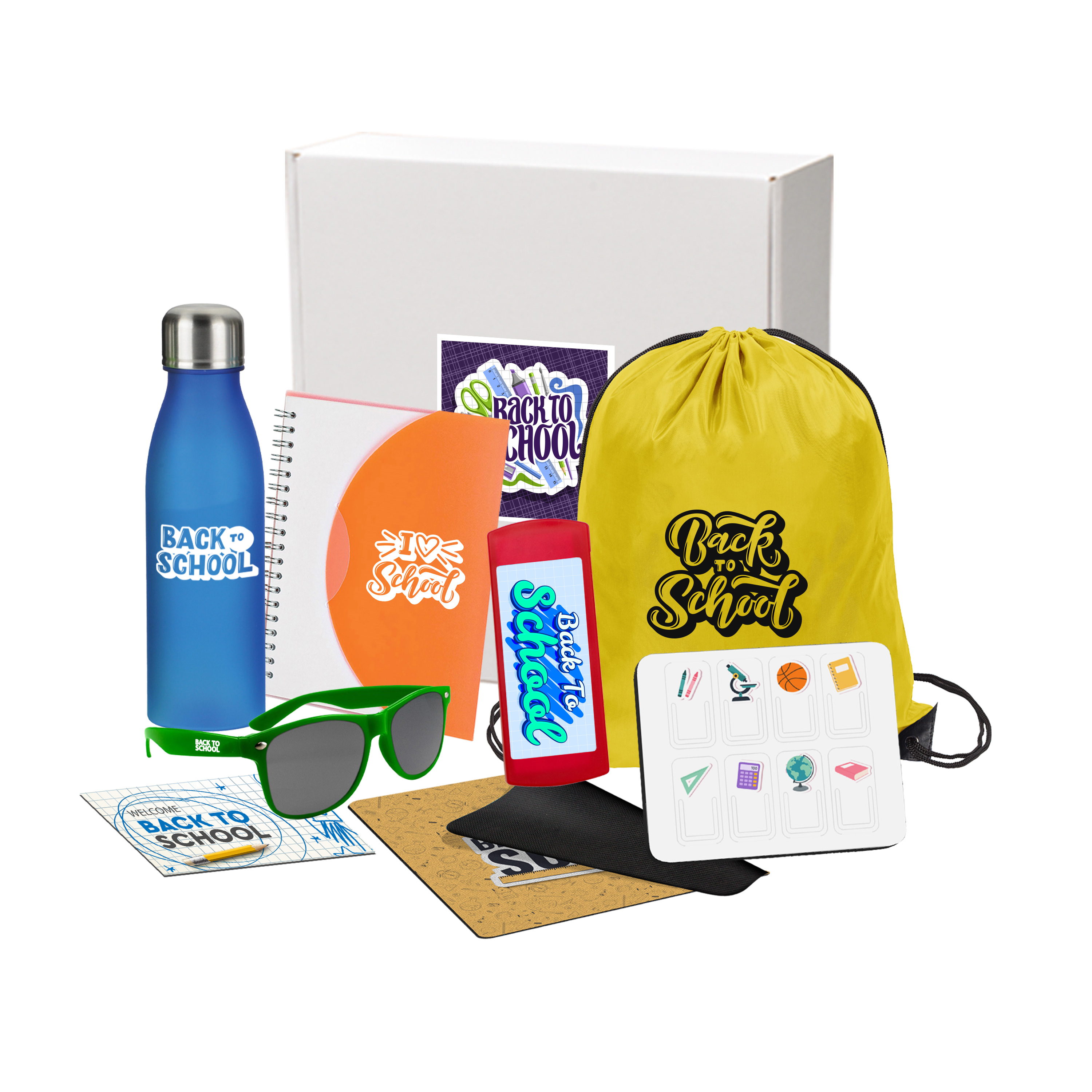 A great kit to exercise minds of all ages! This boxed collection of items keeps people hydrated with a Tritan water bottle, protects eyes with sunglasses, treats scrapes, provides a book to jot down notes, keeps a place in a good book and delivers a beautiful mousepad.