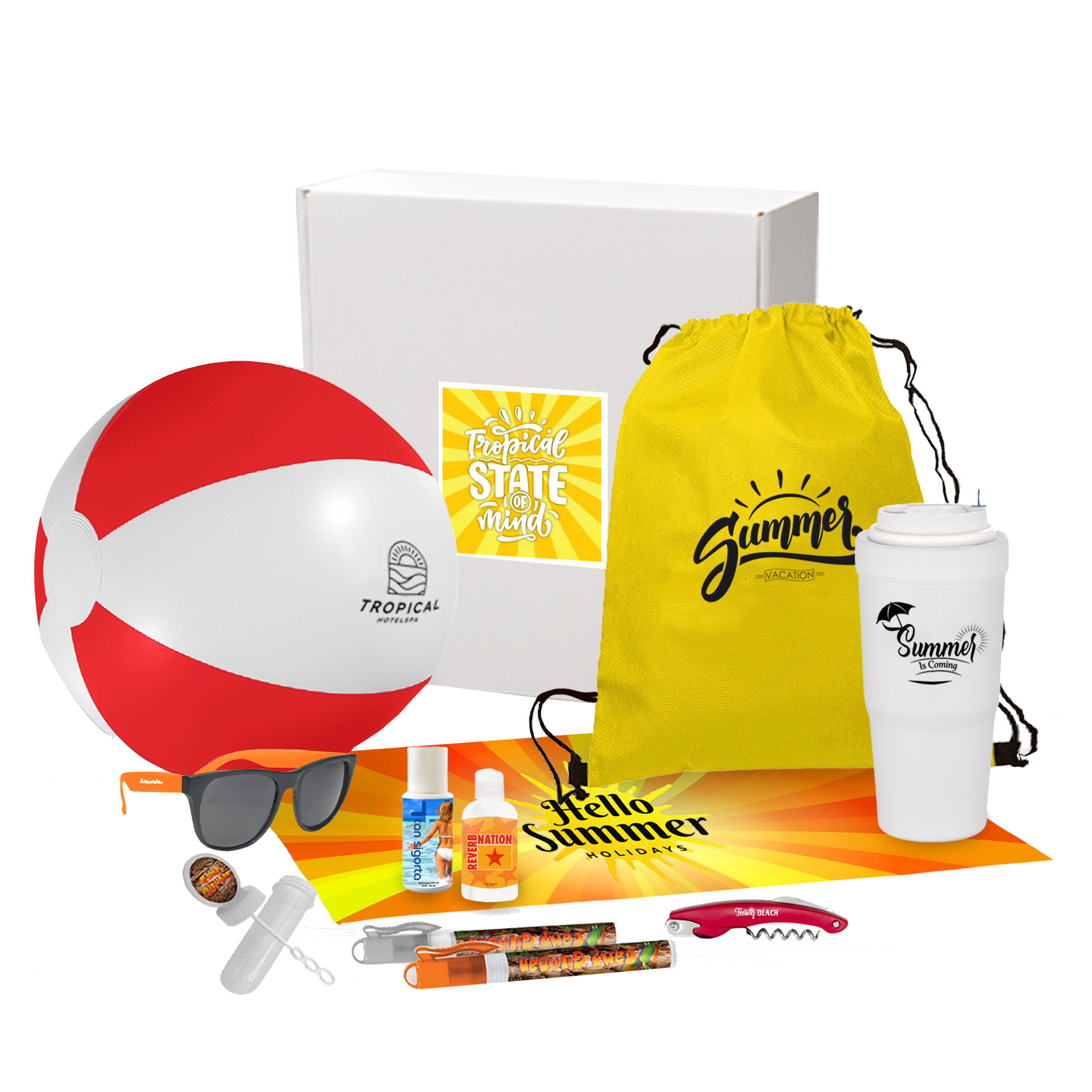 Your promotion or event will be a ray of sunshine with this comprehensive kit built for a day in the sun. Stay protected with SPF 30 sunscreen, shield eyes with UV400 sunglasses, hydrated with the multipurpose Versa Cup and keep refreshed with a full color cooling tool. Remember to have fun with the beach ball. More useful items round out the kit.